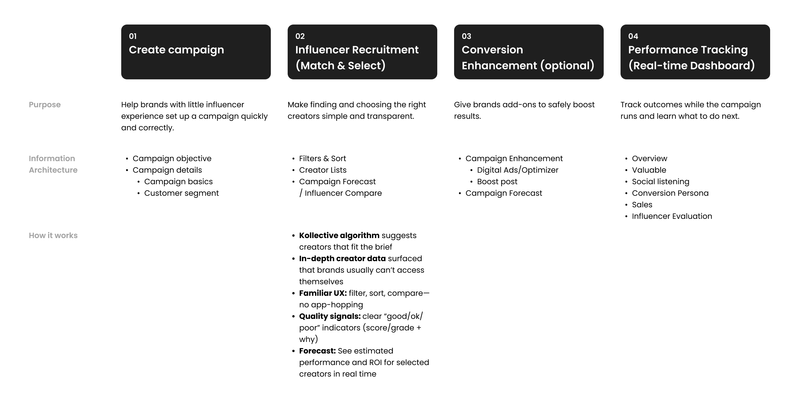 At first, the MVP was planned to be built in website. But after discussing with the team and realizing we didn’t have front-end resources to support the build, we decided to shift the approach. Since all creator and brand data already lived in Google Sheets, we created a functional, website-like prototype directly in Sheets instead. Tabs acted as pages, filters and sorts mimicked the selection UI, formulas powered budget , forecast math, and simple charts showed results. This allowed us to move faster, validate the idea with real users, and simulate the actual experience without development effort.